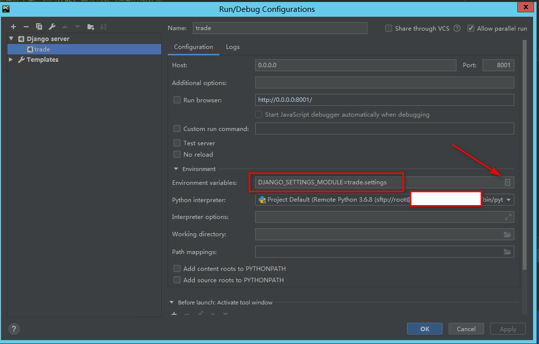 pycharm启动远程django报找不到settings的错误2022年2月8日折腾 首页 折腾 pycharm启动远程django报找不到settings的错误 无意间解决了,因此无法复现错误,就是run控制台报找不到settings但是终端可以使用python runserver 运行。 看了下manage.py的代码,报错一行是传参那行,于是: 点击右侧按钮删除参数,然后重新运行即可,再看时已经自动填写了正确的参数(trade是项目名称): 上一页 文章 Spark高可用配置方法 下一页 文章 crontab定时任务: